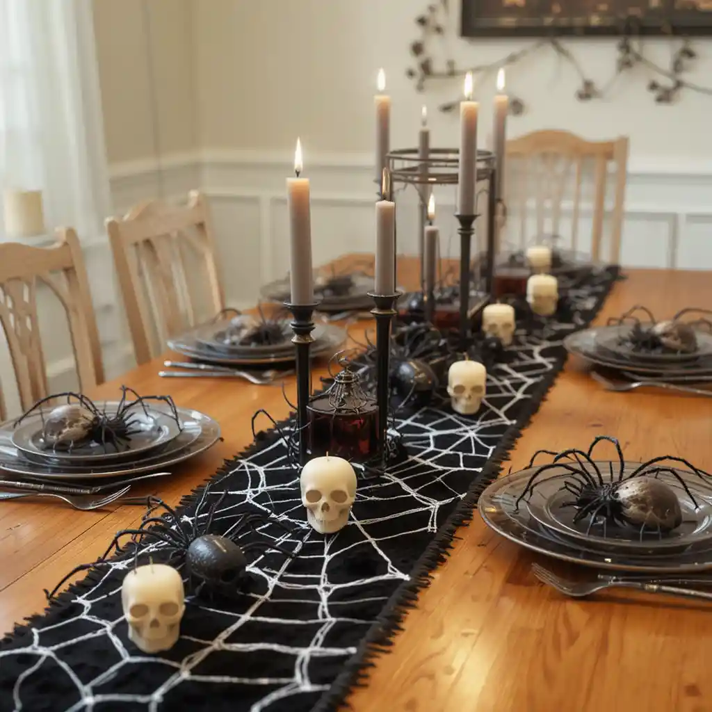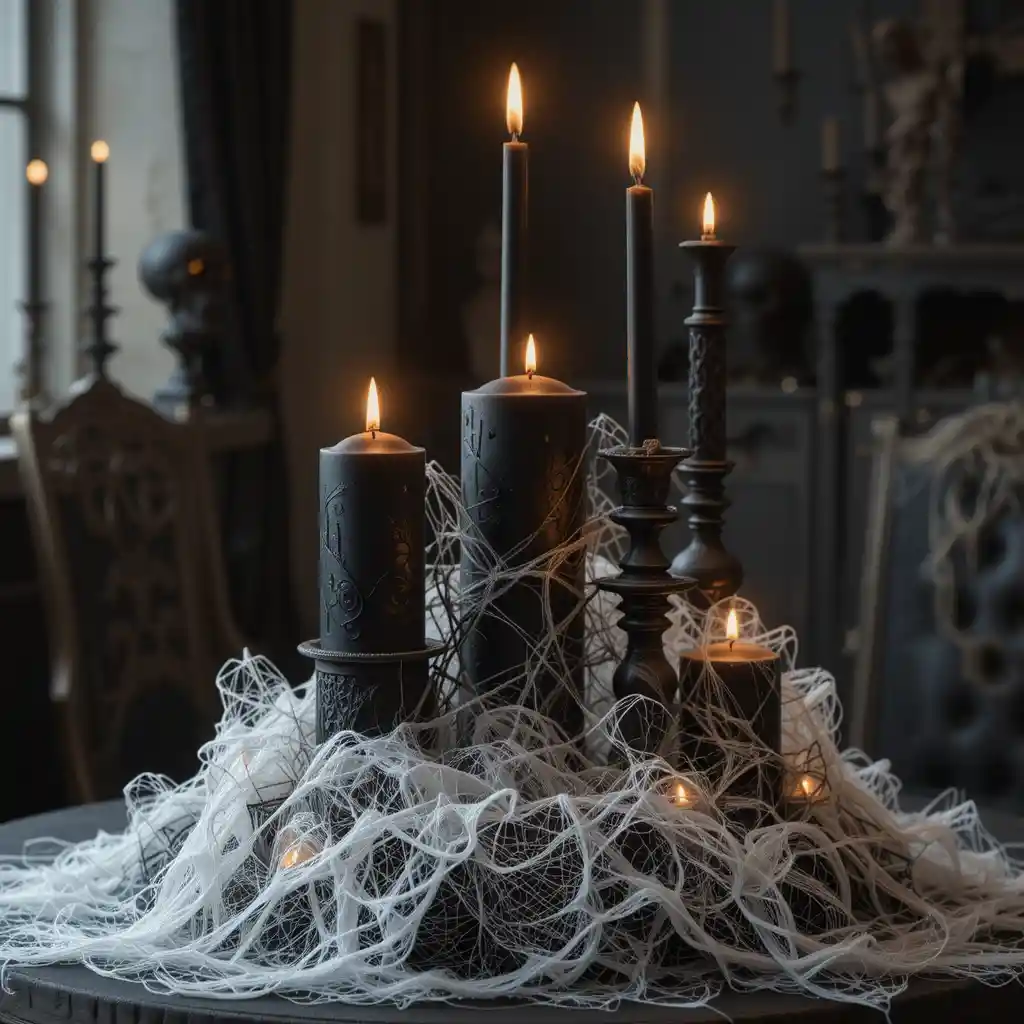 Set the mood with tall black candles in antique holders surrounded by faux cobwebs. The flickering light creates a spooky yet elegant glow that instantly sets a haunted house vibe.