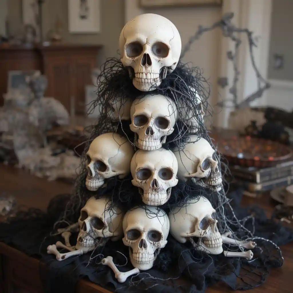 Stack a few skulls of different sizes on a black cloth base. Add plastic bones or cobwebs to create a graveyard-inspired centerpiece that’s perfect for Halloween night.