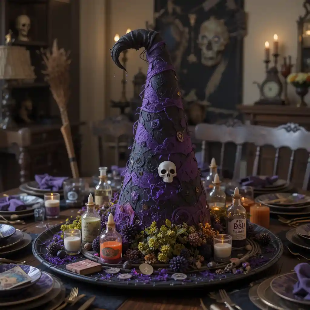 Place a large witch hat in the middle of your table and surround it with potion bottles, broomsticks, and spell book props for a magical setup.