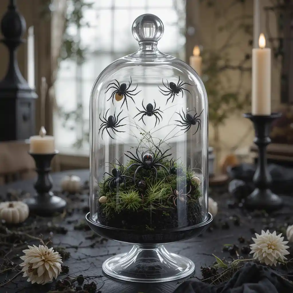 Use a glass cloche dome filled with spiders and dark moss. It creates a creepy “specimen jar” effect that feels both eerie and elegant.
