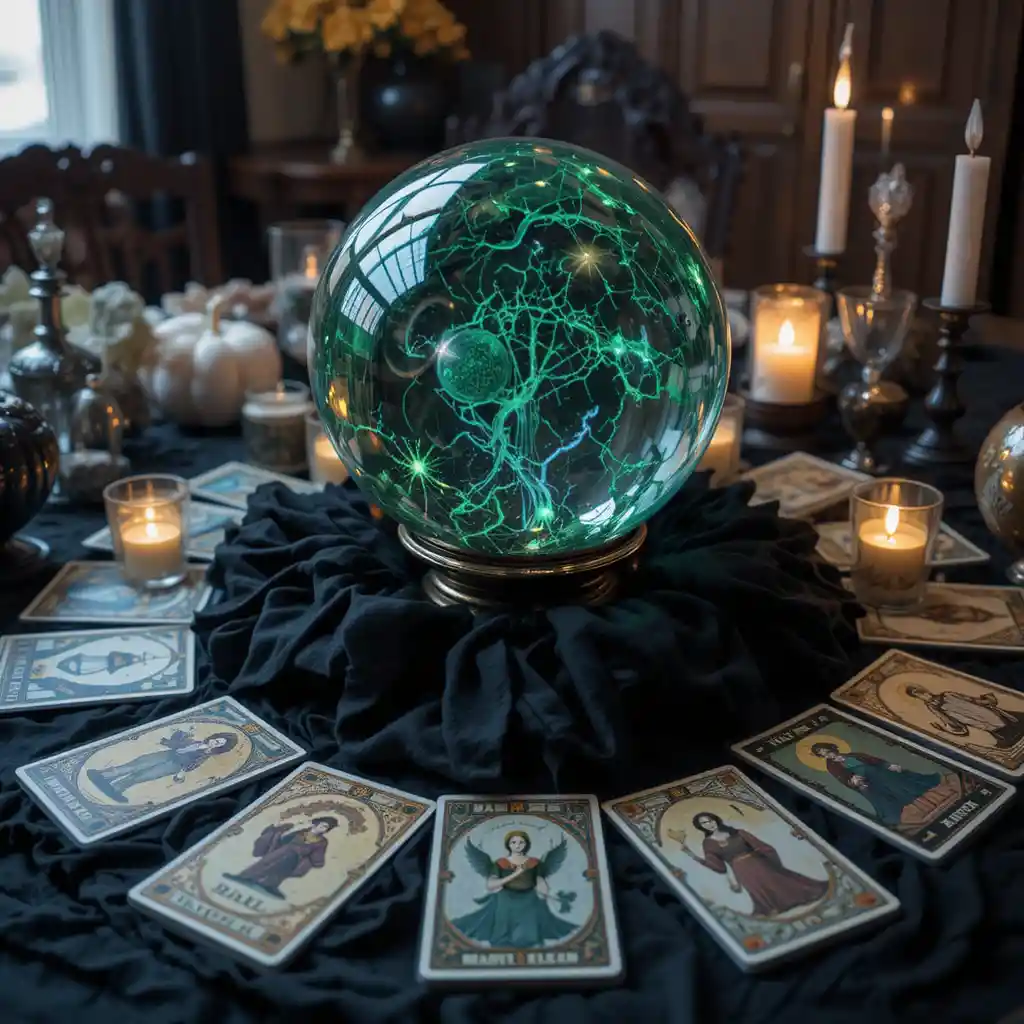 Add a glowing crystal ball as the main feature. Surround it with tarot cards, dark cloth, and candles to create a mystical fortune-teller’s table centerpiece.