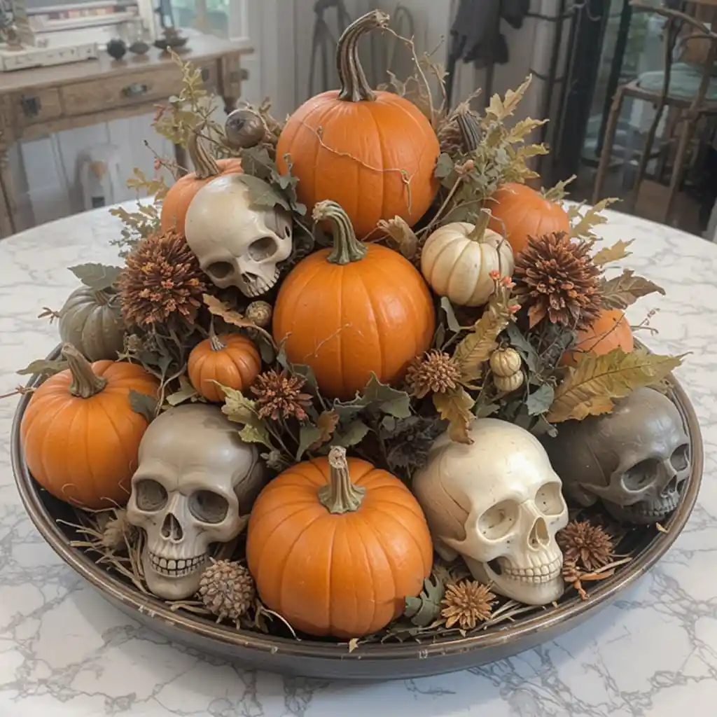 Combine mini pumpkins and skulls in a large decorative tray. Mixing natural autumn vibes with spooky Halloween elements creates a balanced centerpiece.