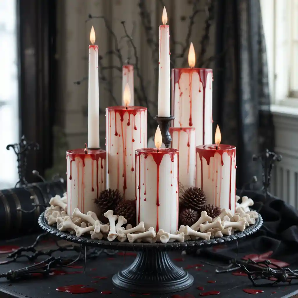 Use white candles with red wax drips to mimic blood. Place them on a gothic stand surrounded by faux bones for a chillingly dramatic effect.