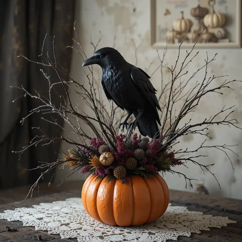 Add a realistic black raven prop perched on branches or a pumpkin centerpiece. Ravens instantly bring a dark, Edgar Allan Poe-inspired atmosphere.