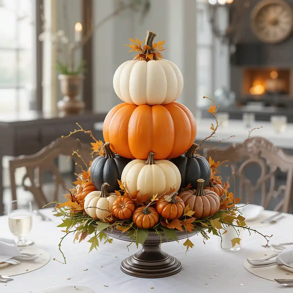 Stack different-sized pumpkins in a tiered arrangement for a bold, fall-inspired centerpiece. Mix orange, black, and white pumpkins to add contrast and Halloween charm.