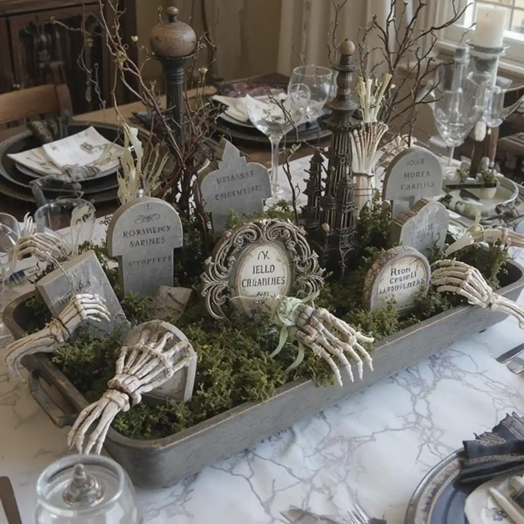 Fill a serving tray with tiny tombstones, moss, and skeleton hands. It creates a mini graveyard scene that makes your Halloween dinner table unforgettable.