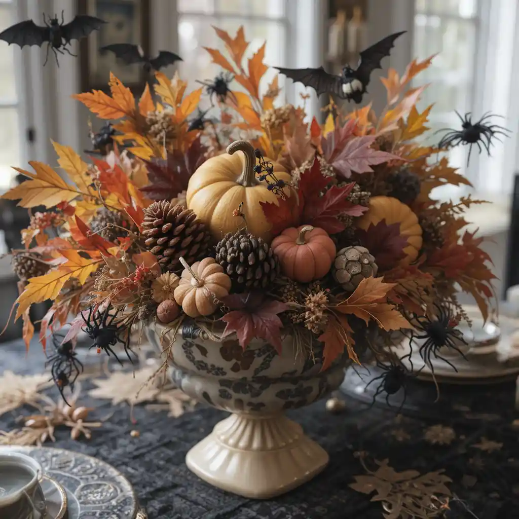 Mix autumn décor with spooky details by arranging fall leaves, pinecones, and gourds alongside spiders, bats, or black lace. It blends cozy fall vibes with a haunting twist.