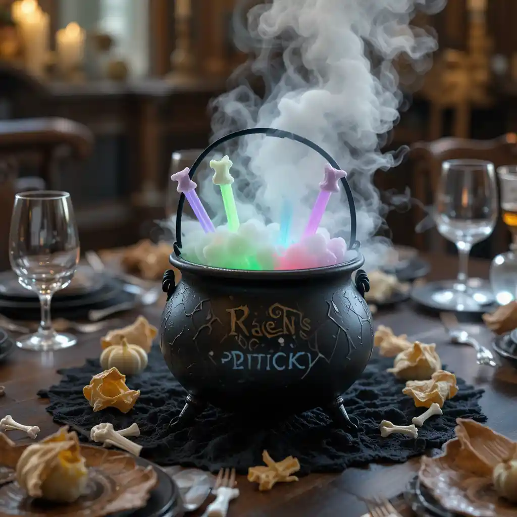 Place a mini cauldron in the middle of the table filled with dry ice or fog machine mist for a smoky, bubbling effect. Add plastic bones or glow sticks for an eerie touch.