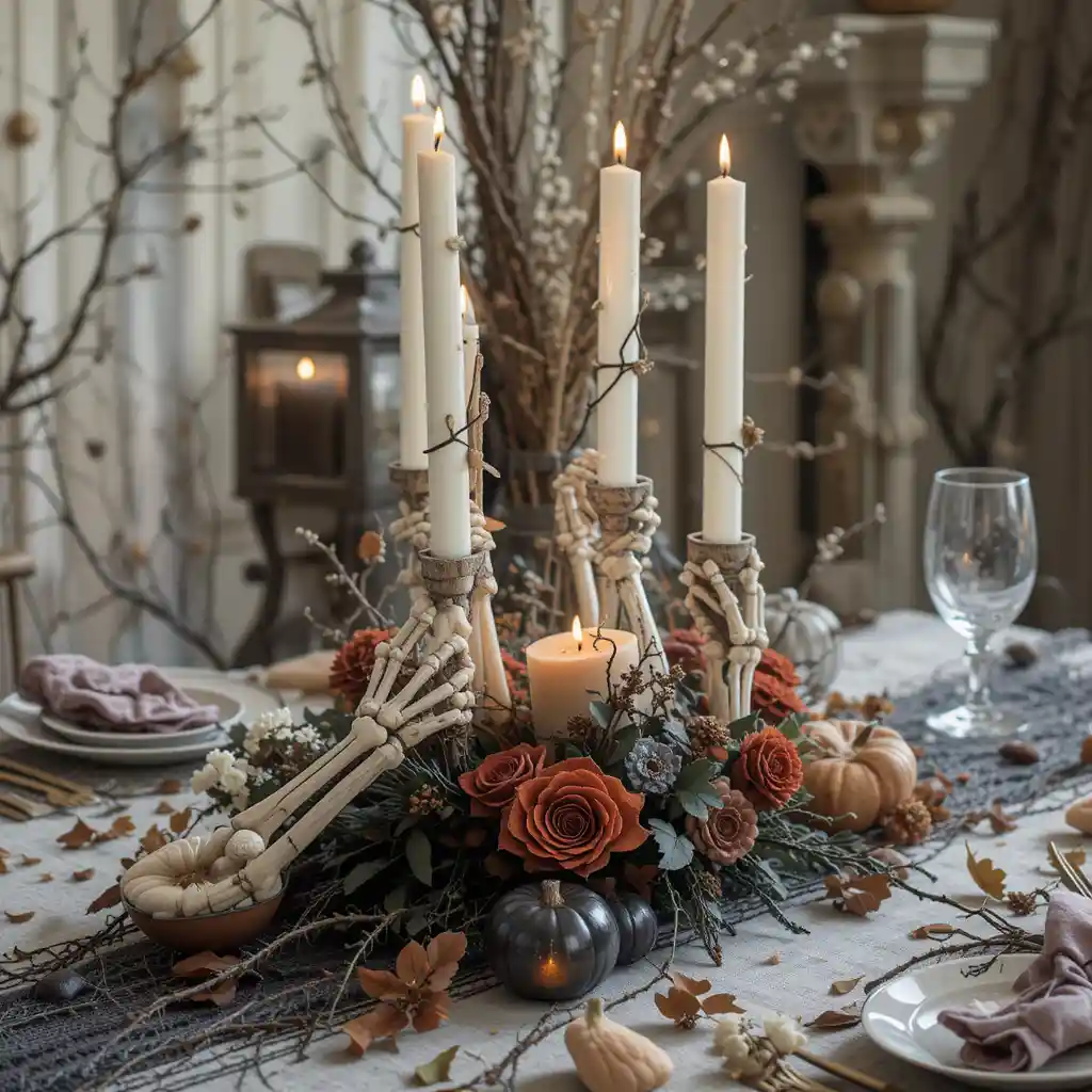 Position skeleton hands gripping taper candles as your focal point. It’s a spine-chilling centerpiece that looks both eerie and creative.