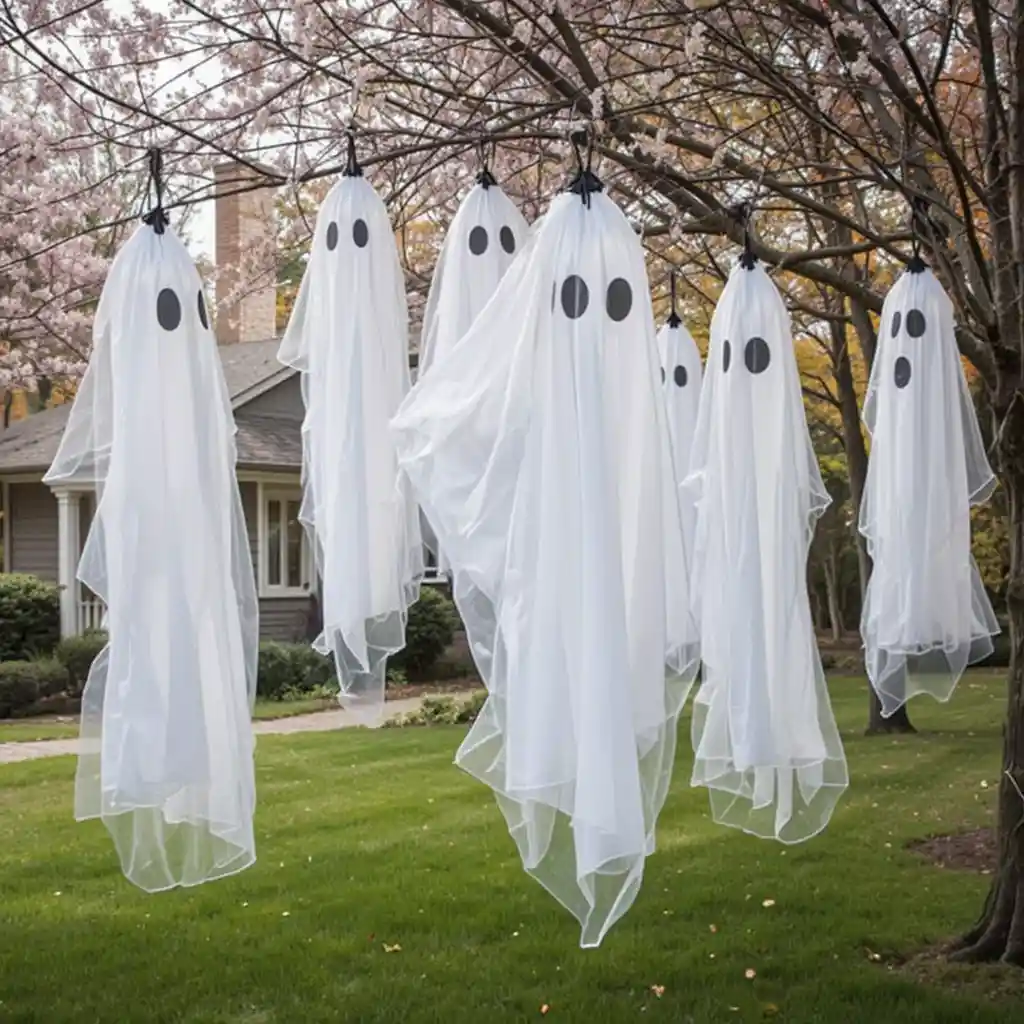 Use white sheets with cut-out eyes to make floating ghosts. Hang them from tree branches to sway gently in the wind.