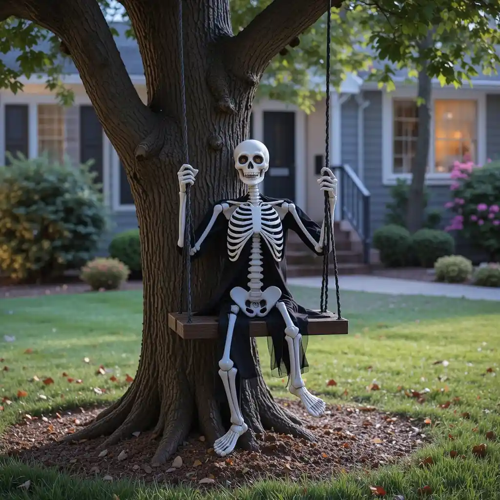Hang a skeleton figure on a tree swing for a playful yet chilling scene. Add a spotlight to highlight it at night.