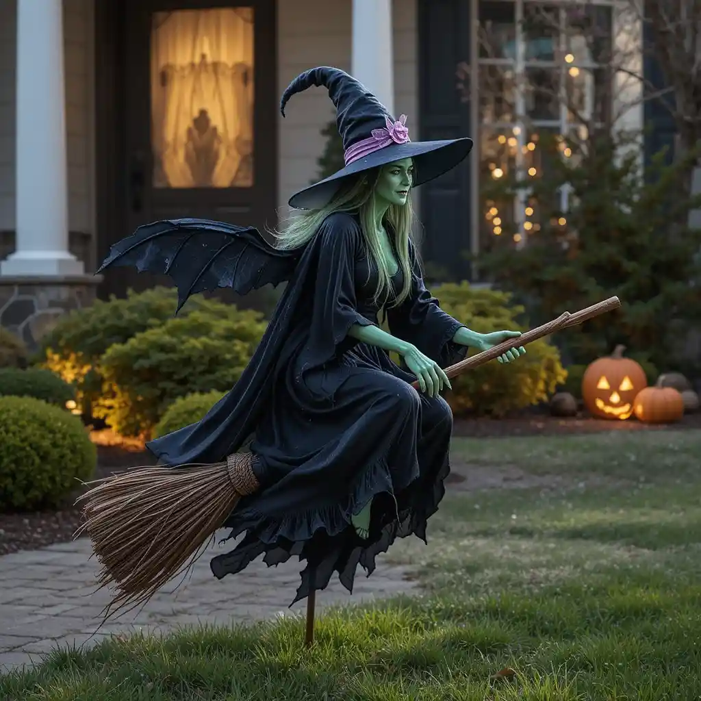 Add an animatronic witch flying on a broom. With motion and glowing lights, it brings a magical yet spooky effect.