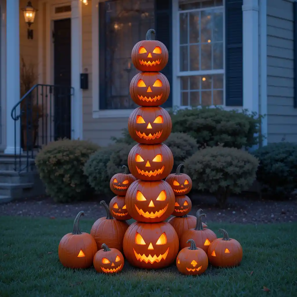 Stack pumpkins of different sizes to form a tall tower. Carve a few with scary faces and add LED candles inside for glowing effects.