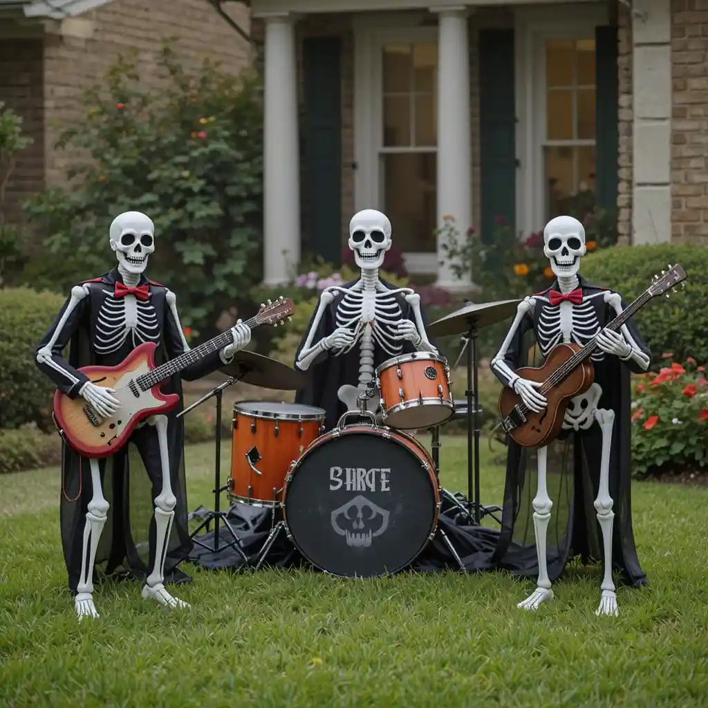Set up skeletons holding instruments to form a spooky outdoor band. Their playful vibe will make visitors smile while keeping the Halloween theme strong.