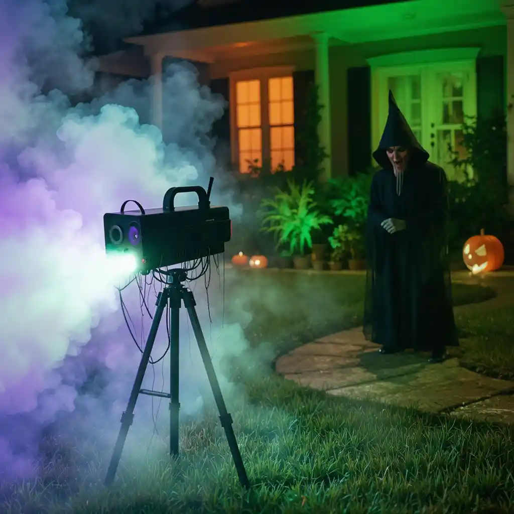 A fog machine combined with green or purple lights creates a mysterious, haunted atmosphere. It makes every other decoration look scarier.