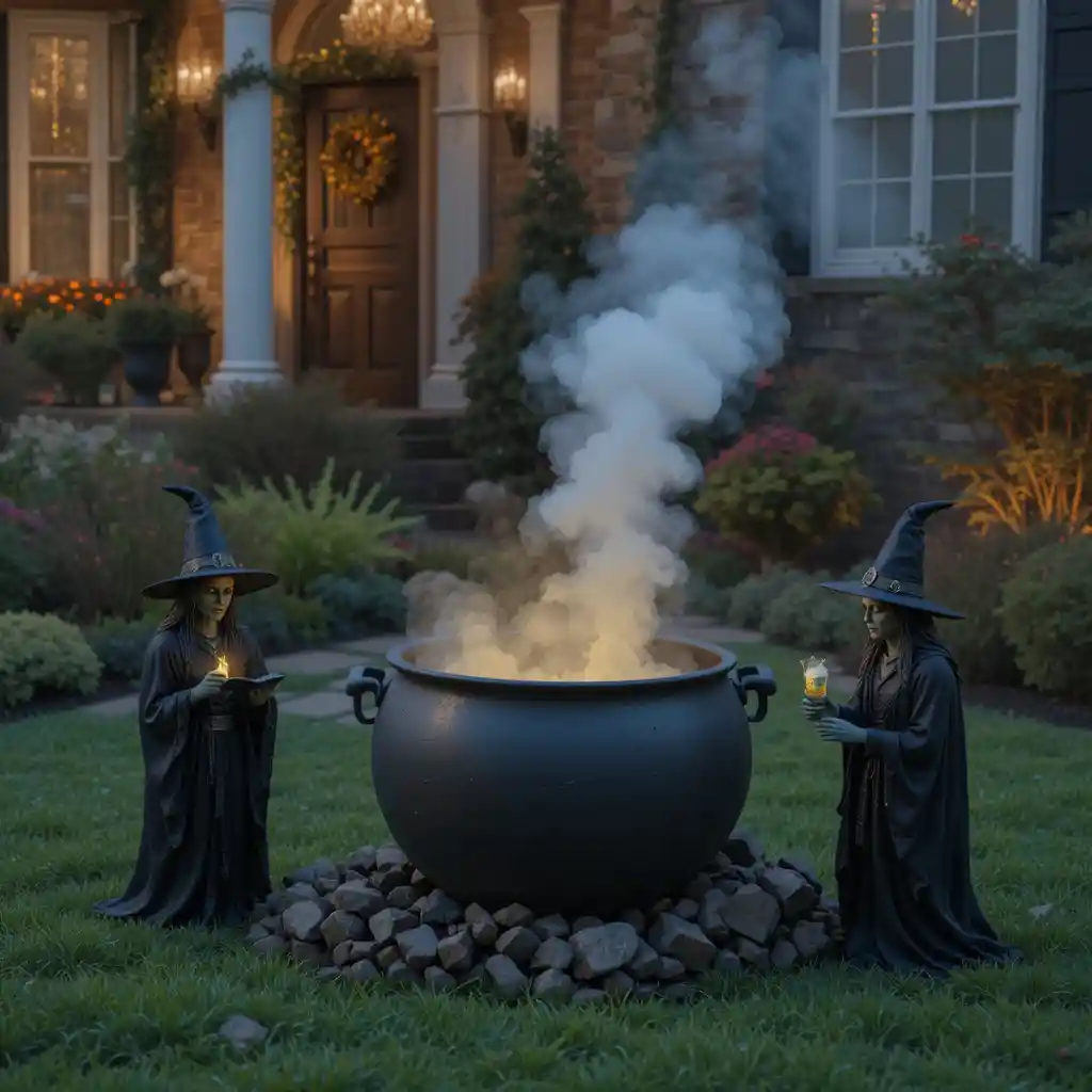 Set up a black cauldron with glowing lights and witch figures around it. Add fake smoke or dry ice for an enchanting effect.
