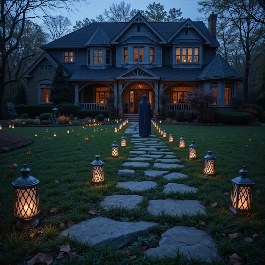 Line your driveway or lawn with lanterns glowing in eerie colors. It guides visitors while adding a gothic Halloween vibe.