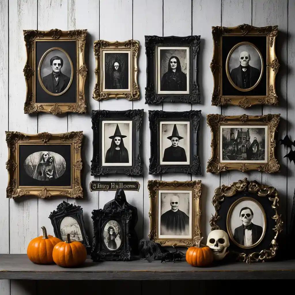 Print vintage Halloween posters or eerie black-and-white photography. Frame them in distressed wood or ornate gold frames for a dramatic effect.