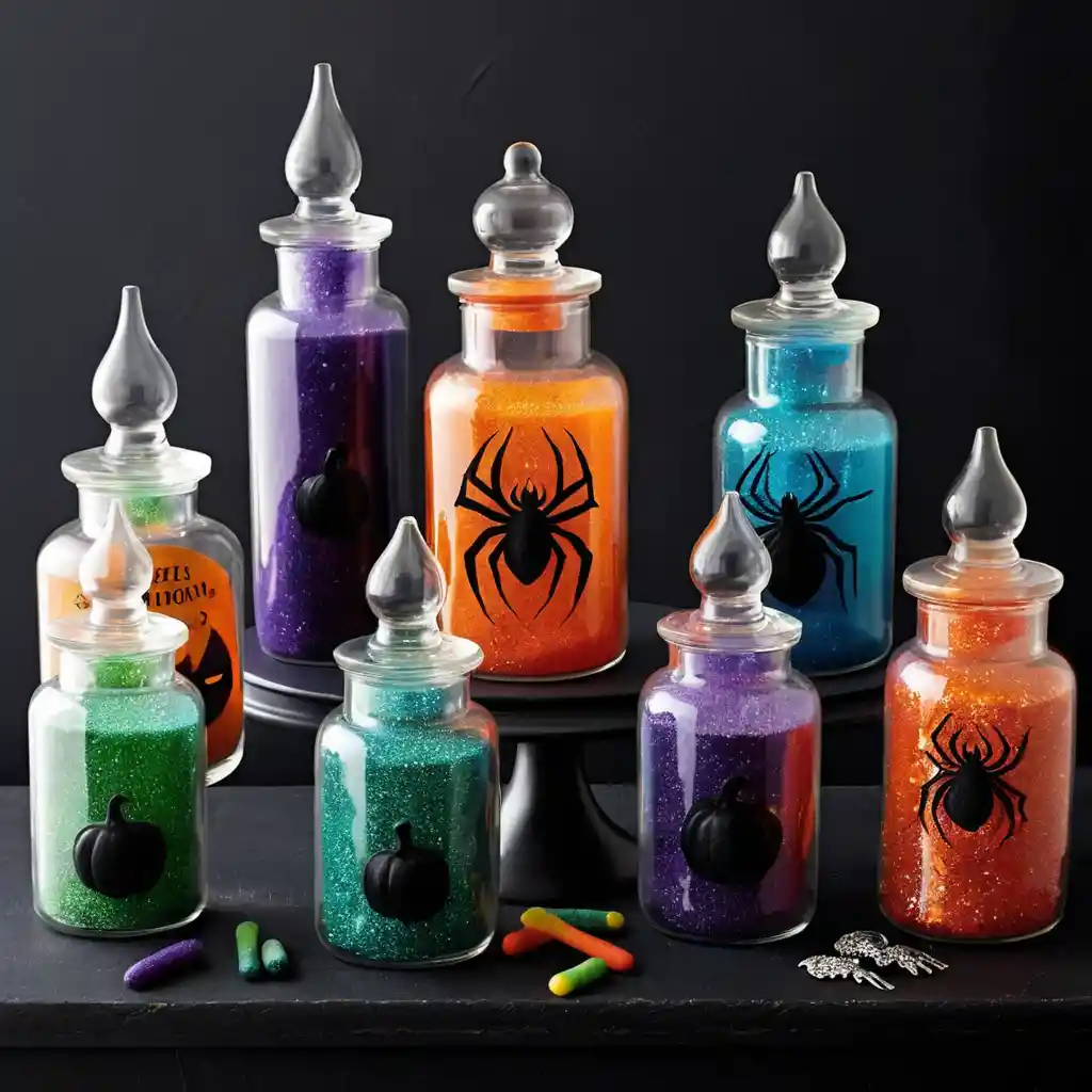 Fill glass jars with colored water, glitter, or even gummy worms. Label them with spooky names like “Witch’s Brew” or “Spider Venom.”