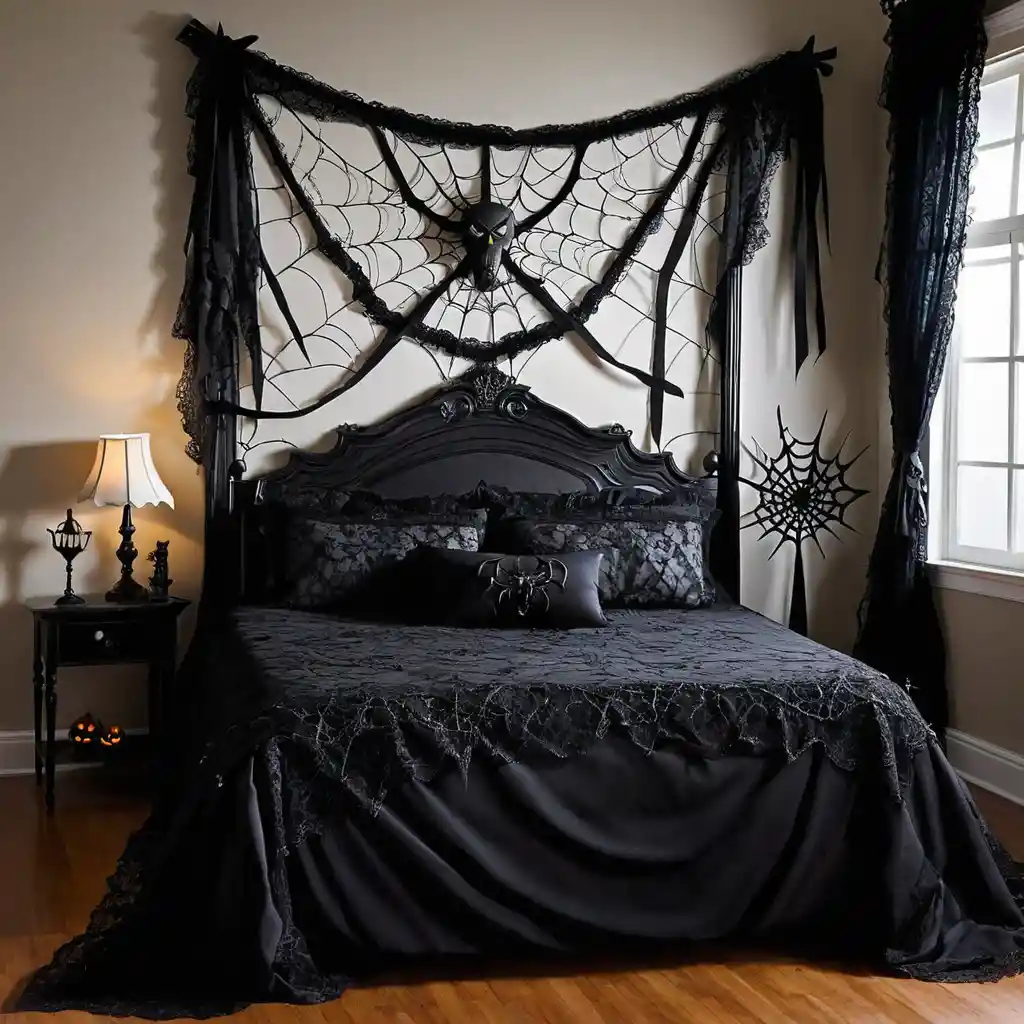 If you have a tufted or wooden headboard, drape it with faux cobwebs or lace. It instantly feels spooky without permanent changes.