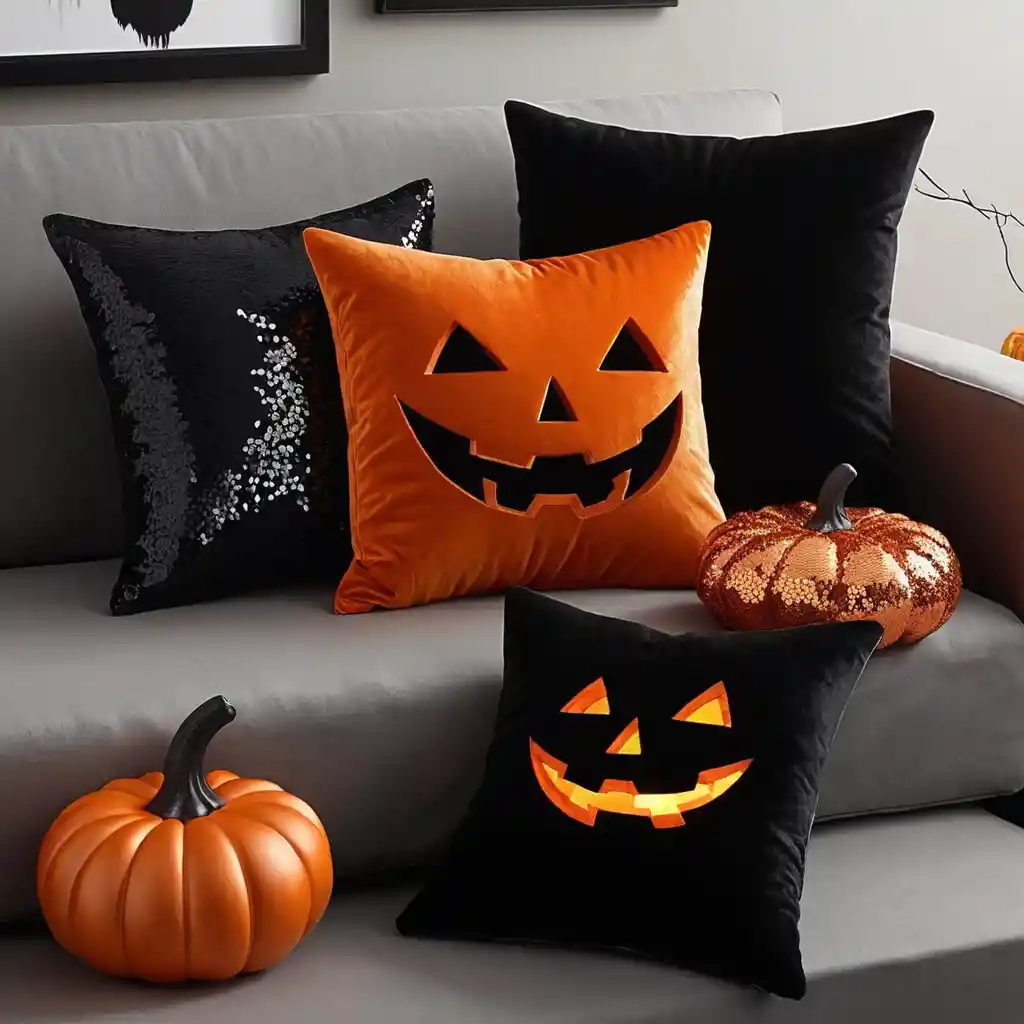 Toss in a few velvet or sequined pillows in deep black and bright orange. They’re budget-friendly and add festive flair to your Halloween party decoration bedroom.