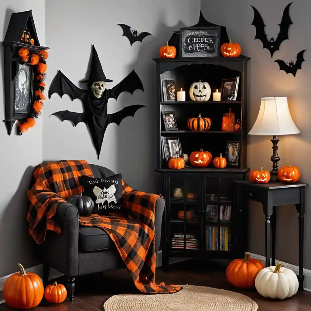 Dedicate a corner of the room to Halloween—add a chair with plaid blankets, a side table with pumpkin lanterns, and a spooky throw pillow.