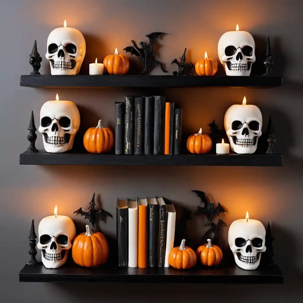 Style your shelves with skull bookends, tiny pumpkins, and themed candles for subtle but striking decoration.