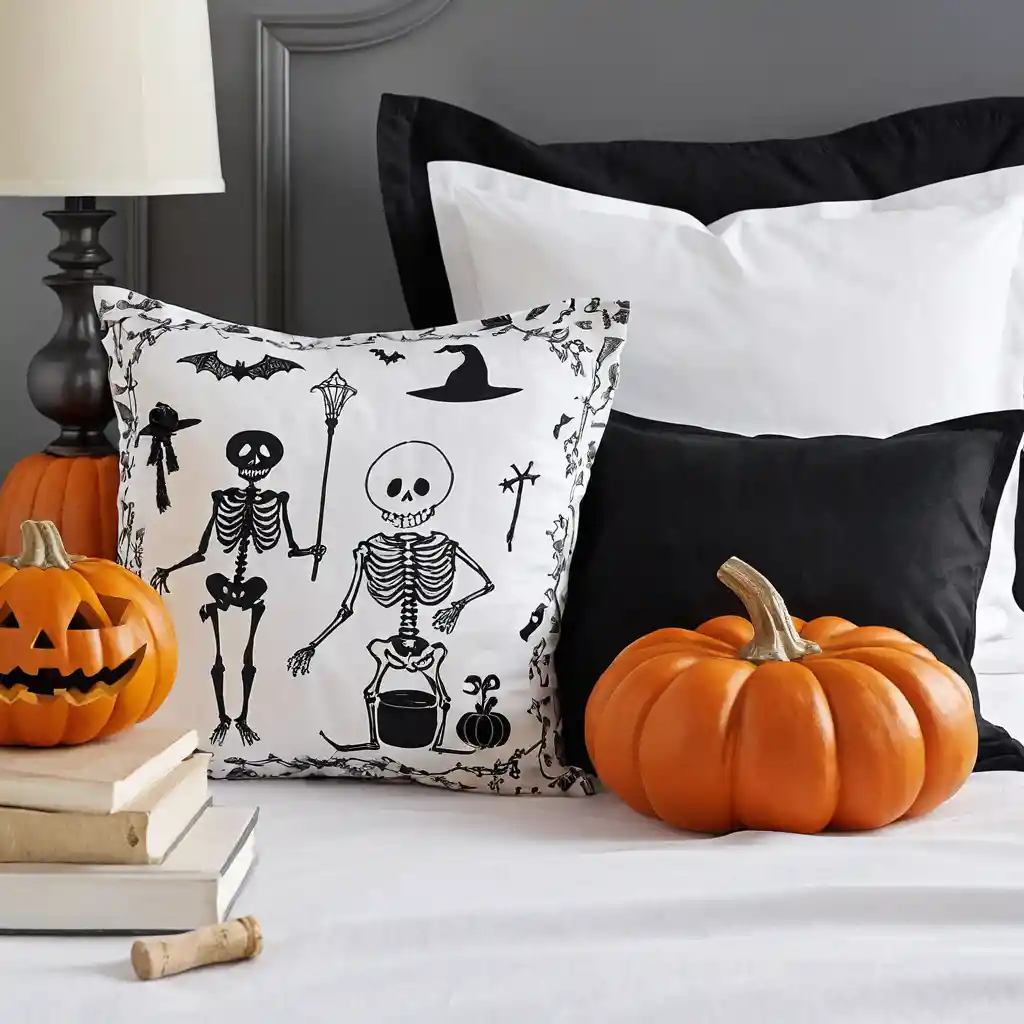 Swap out your everyday bedding for Halloween-themed comforters or duvet covers. Think bats, cobwebs, or pumpkin prints for instant spooky vibes.