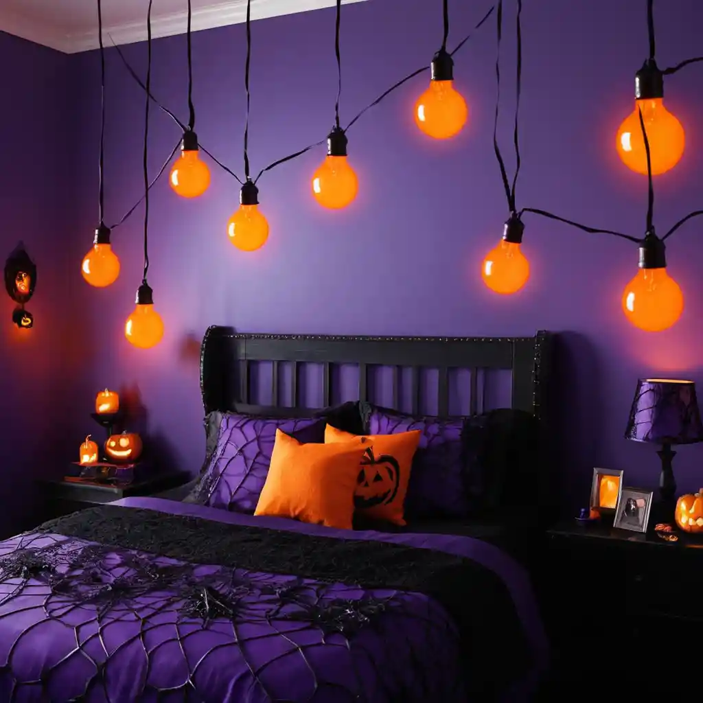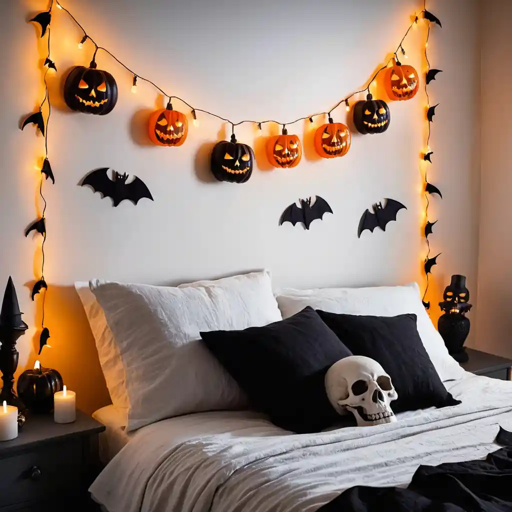 Opt for fairy lights shaped like pumpkins, skulls, or bats. Drape them along your headboard or across the walls.