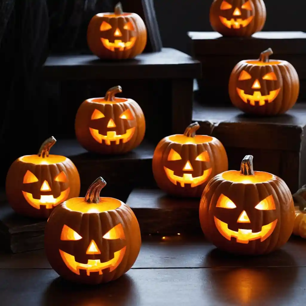 Carve mini pumpkins and insert LED tea lights for glowing accents. Scatter them around for an eerie but cozy effect.