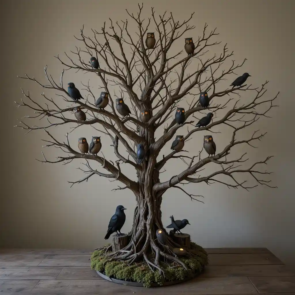 Use natural branches and earthy tones, then mix in owls, crows, and woodland creatures with glowing eyes. Add moss or twigs around the base for an authentic creepy forest feel.