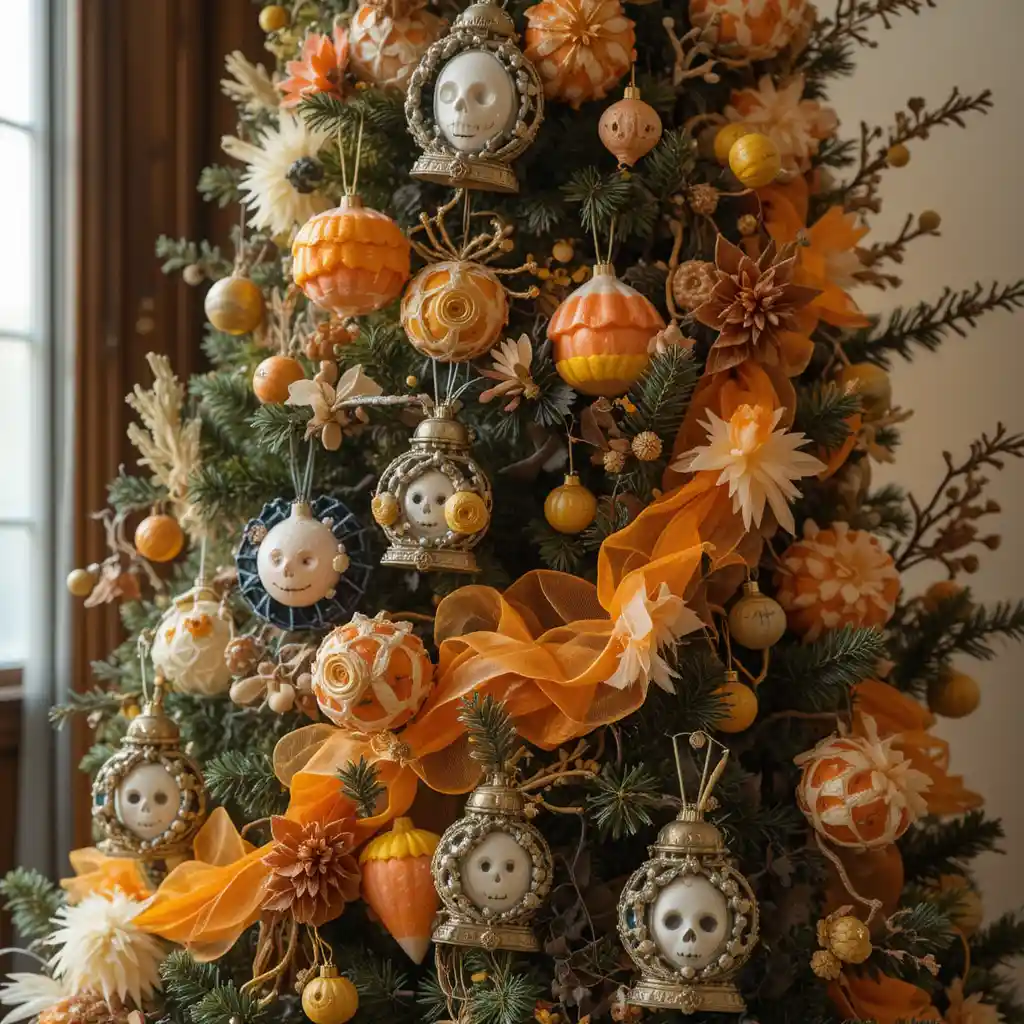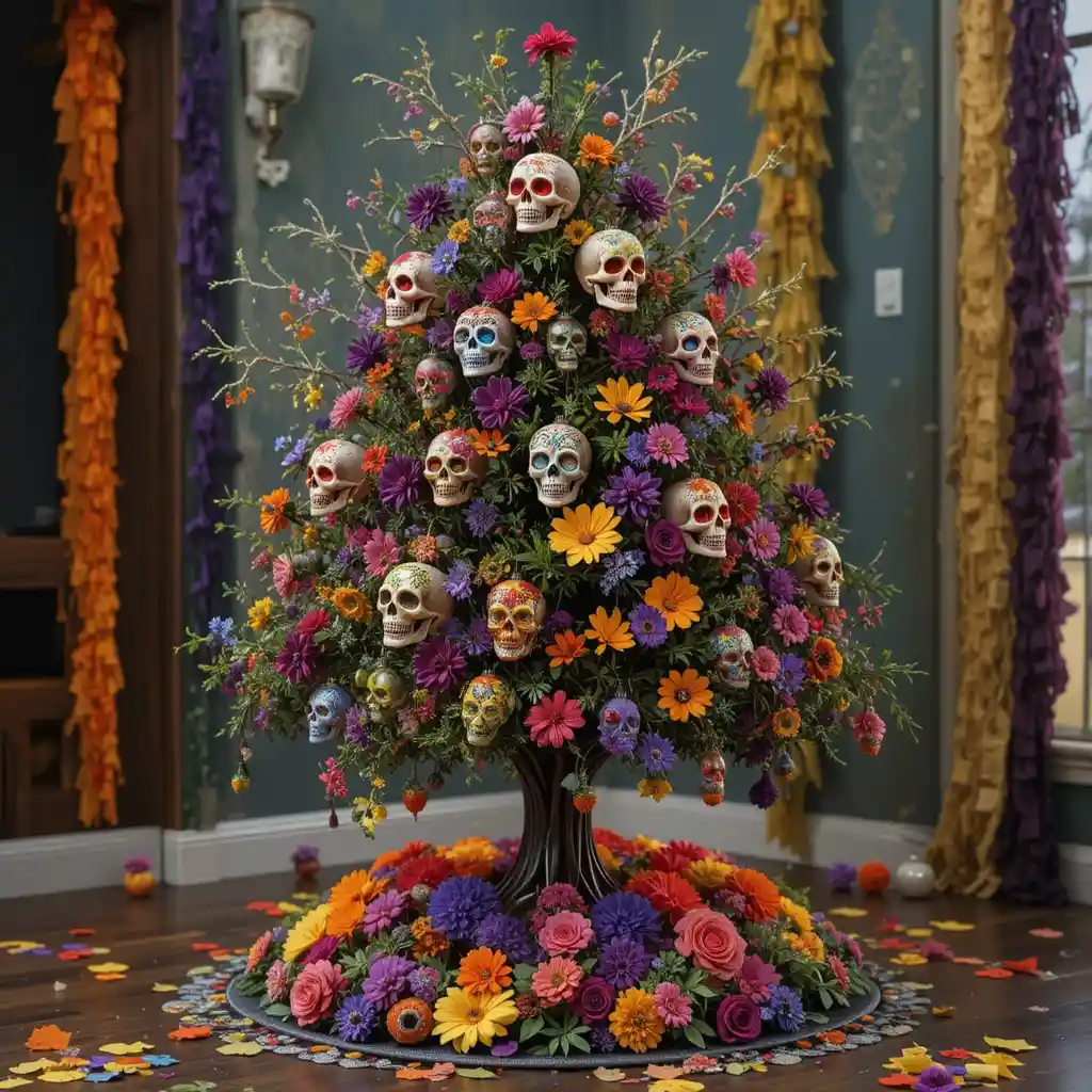 Celebrate with vibrant sugar skull ornaments, colorful flowers, and papel picado–style garlands. This tree combines festive culture with Halloween charm.