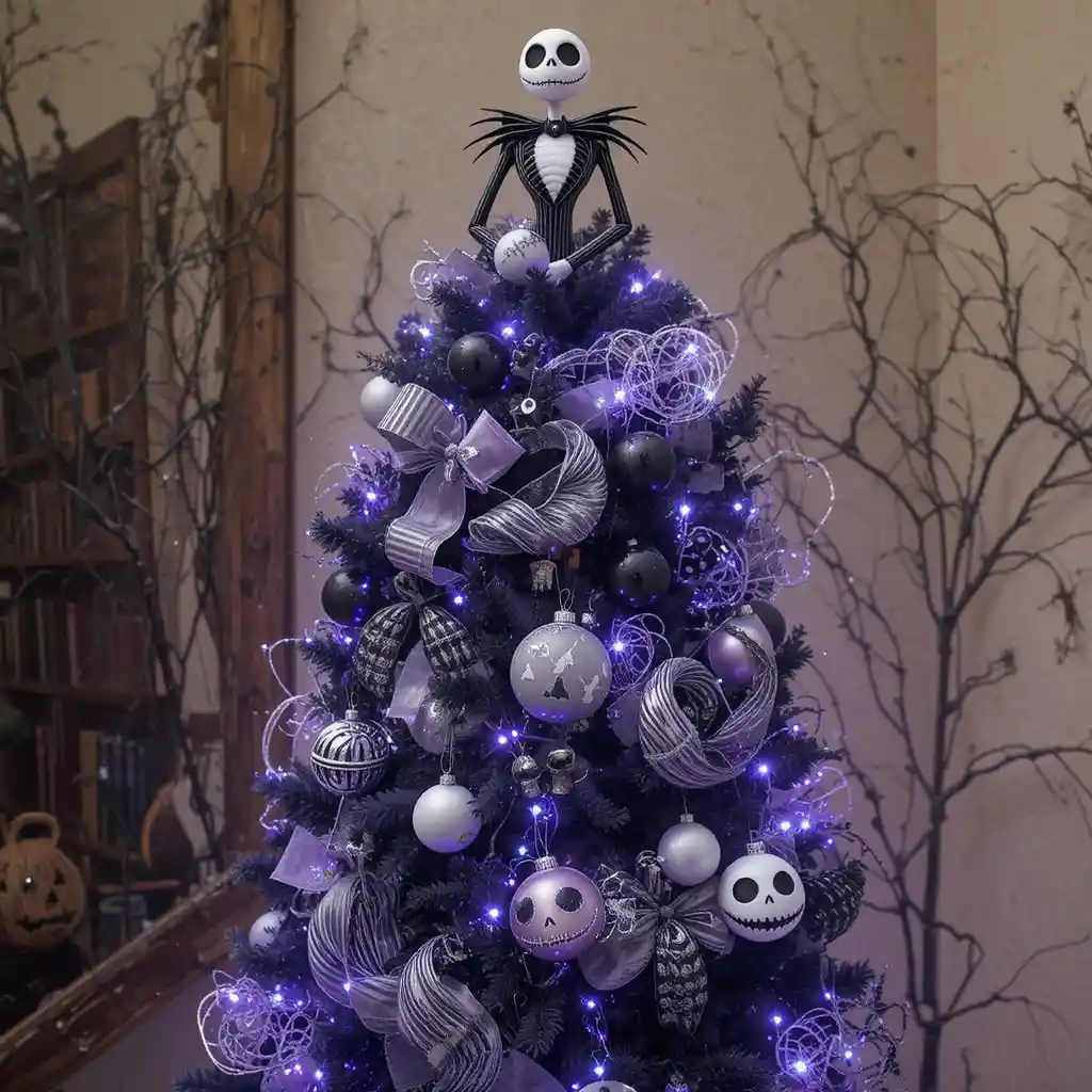 Inspired by The Nightmare Before Christmas, decorate with Jack Skellington ornaments, striped ribbon, and black-and-white baubles. A Jack topper will finish the look.