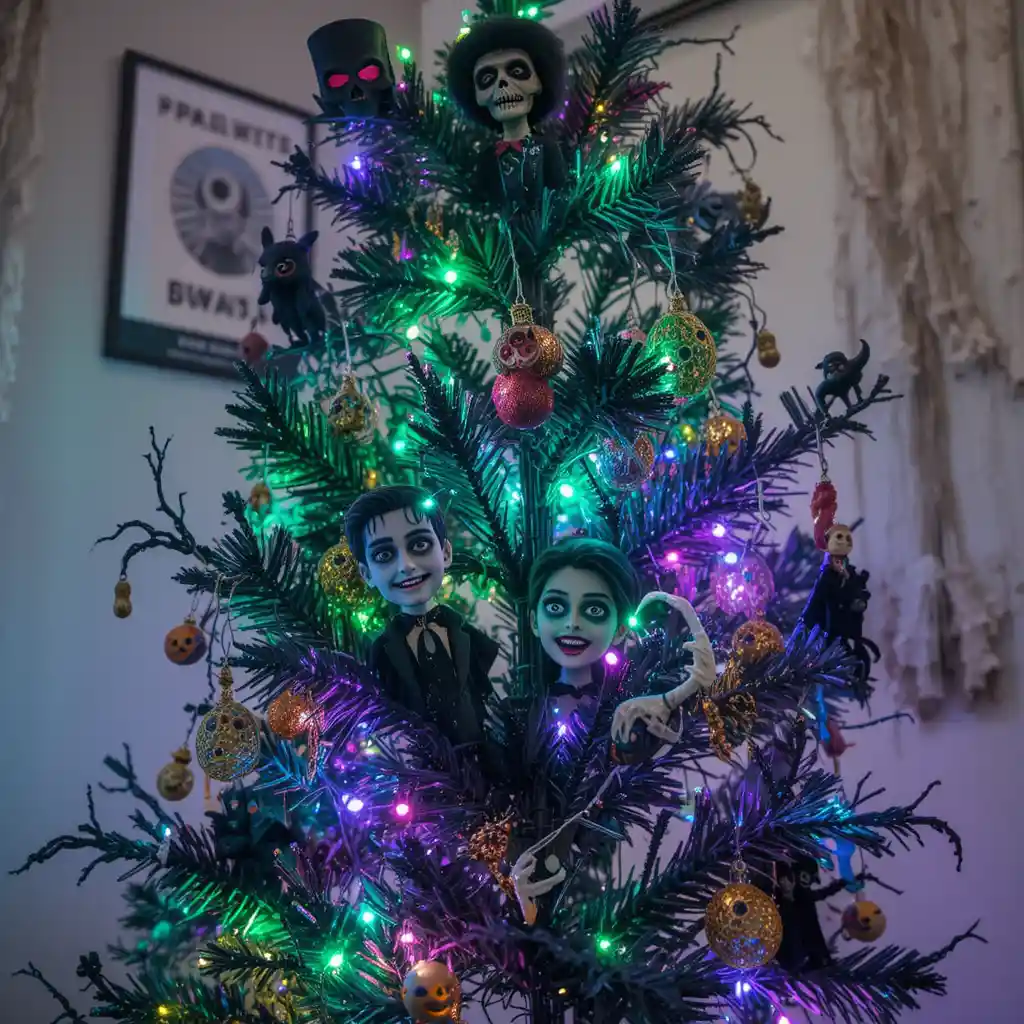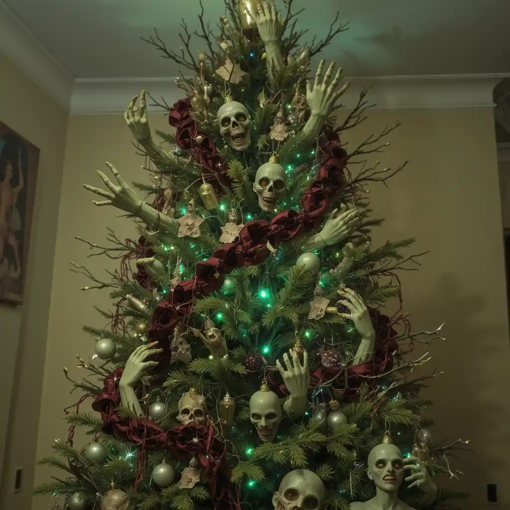 Scatter zombie hand ornaments, bloody garlands, and creepy doll heads throughout the branches. Add green lighting for a sickly undead effect.