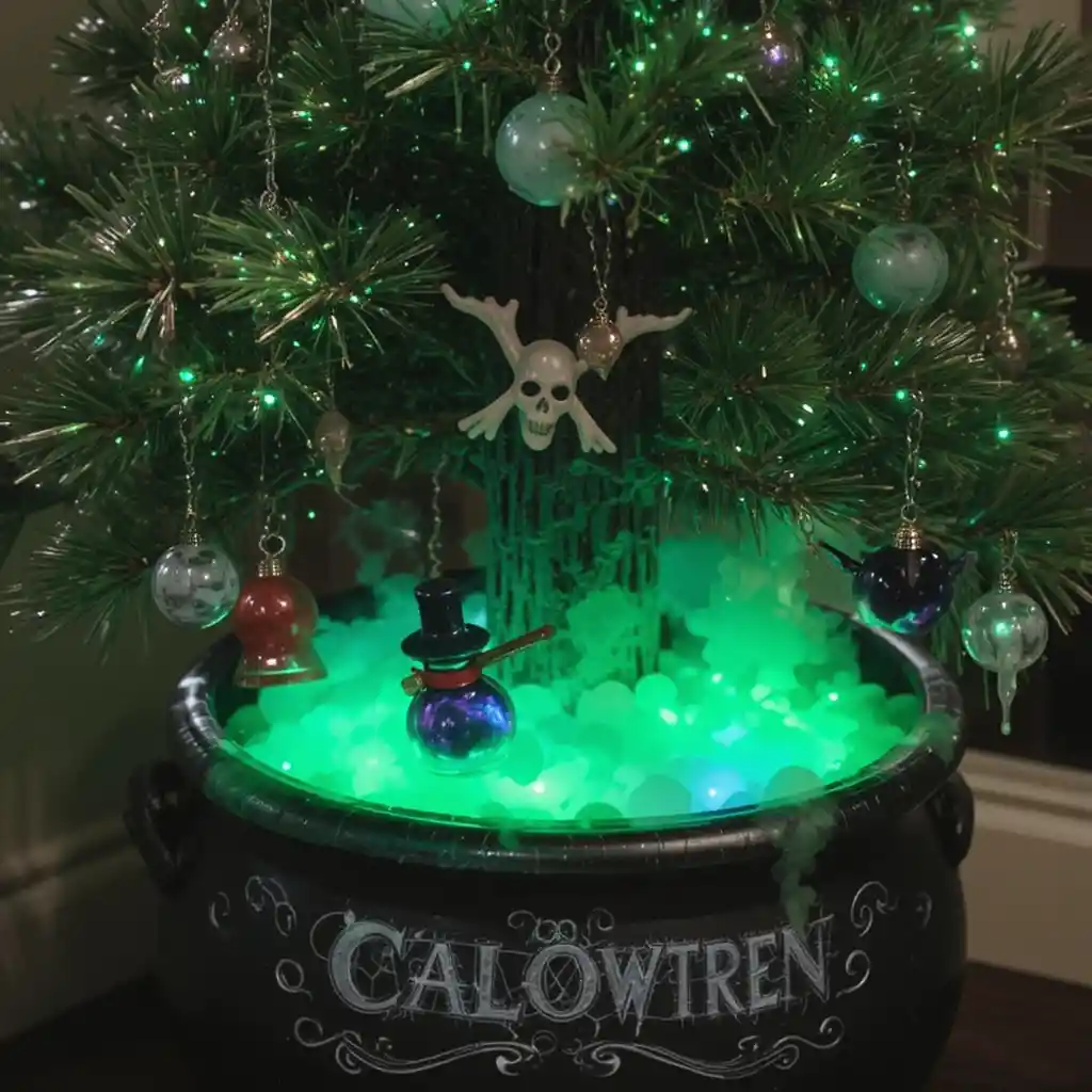 Place a faux cauldron at the tree’s base and fill it with green lights or dry ice effects. Add potion bottles, bubbling slime ornaments, and witch charms for a mystical look.