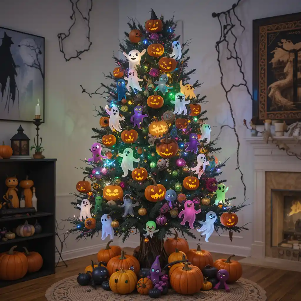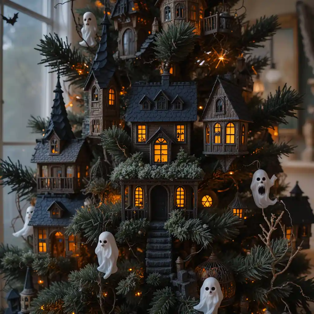 Hang miniature ghost ornaments, add sheer white fabric as a tree skirt, and use soft white LED lights to give your tree an ethereal glow. A floating ghost topper is a fun touch.
