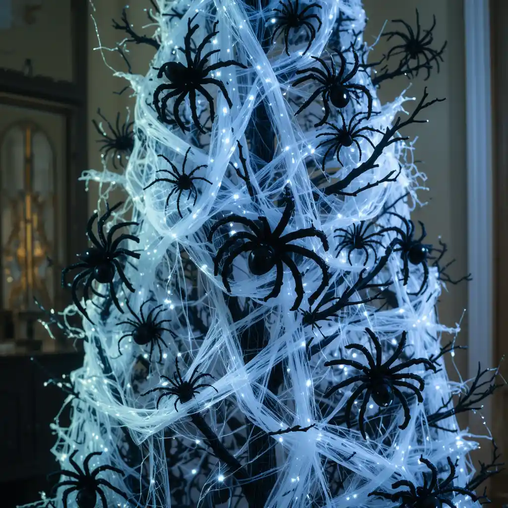 Drape your tree in fake spider webs and add oversized black spiders crawling through the branches. A few glow-in-the-dark web strands will make your tree extra spooky at night.