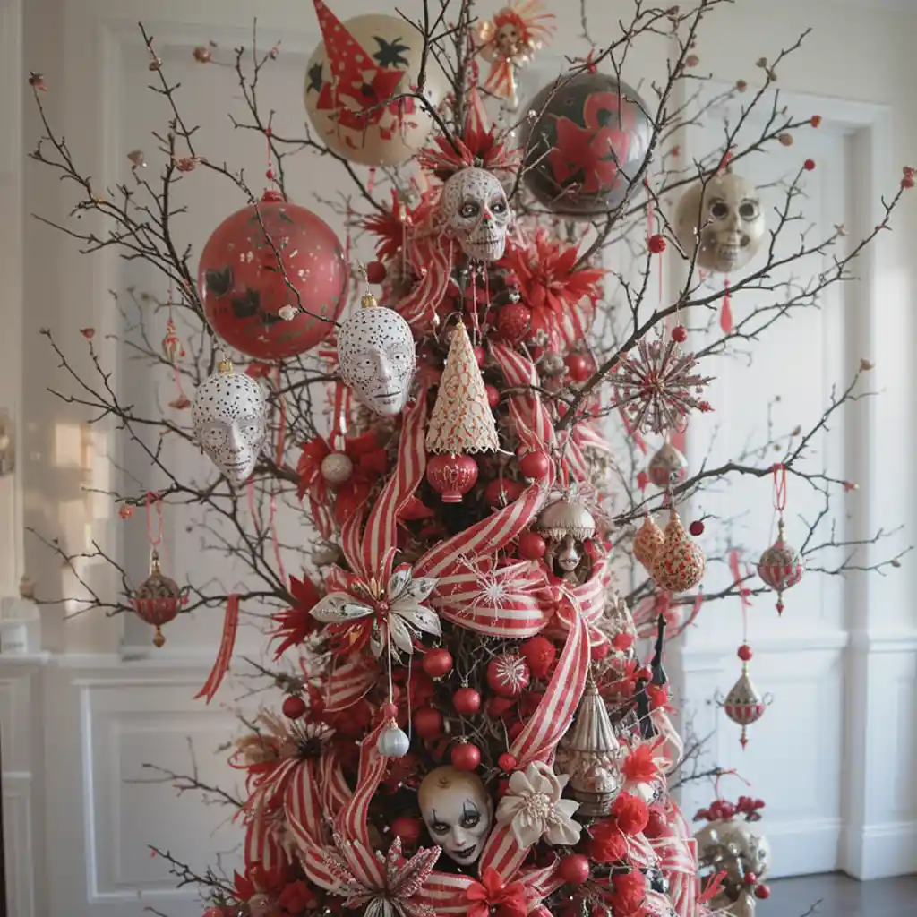 Go bold with red-and-white striped ribbon, clown masks, and creepy circus-themed ornaments. Add balloons tied to branches for a twisted carnival effect.