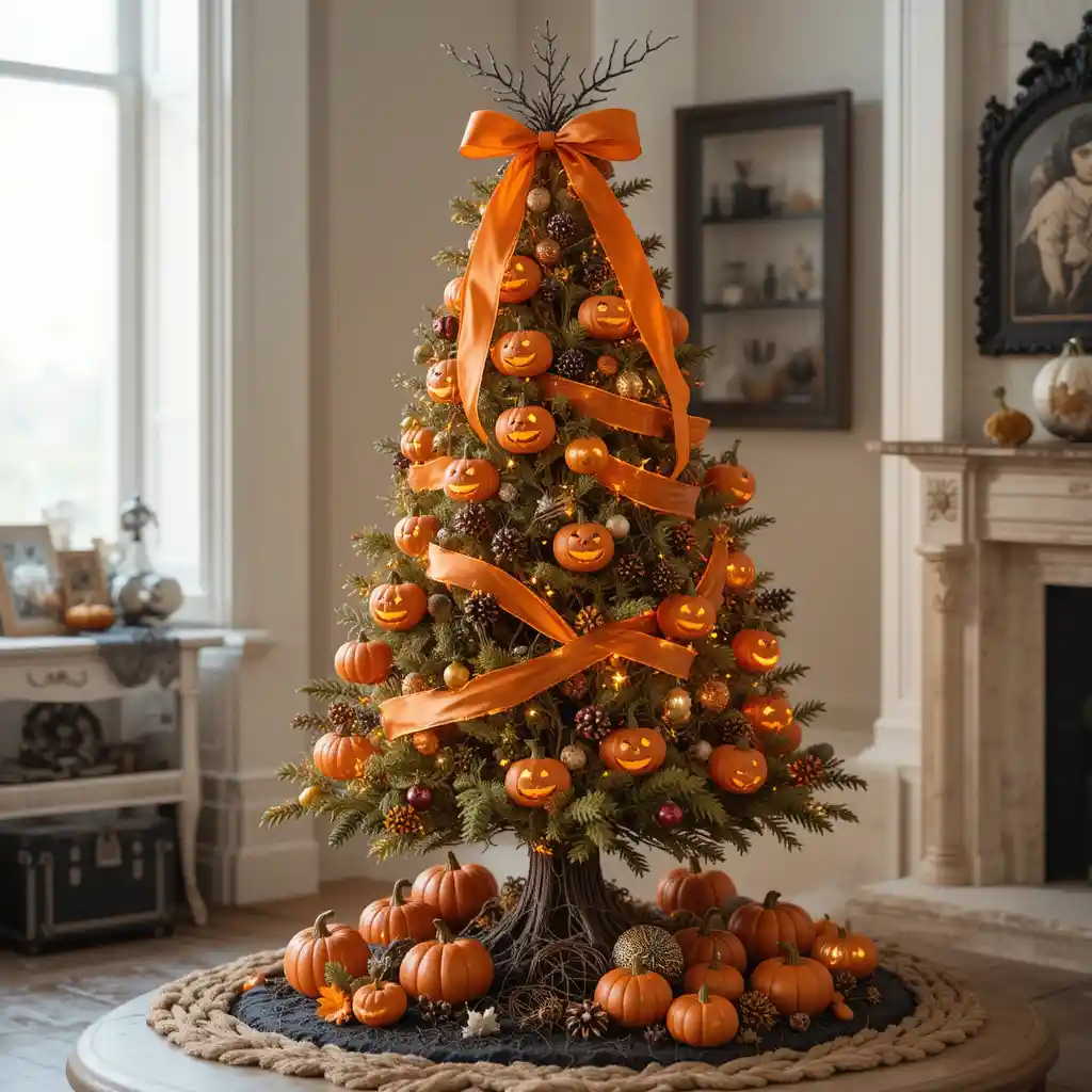 Mix miniature pumpkin ornaments with jack-o’-lantern string lights. Add orange ribbon for a harvest-inspired Halloween tree that’s both festive and spooky.