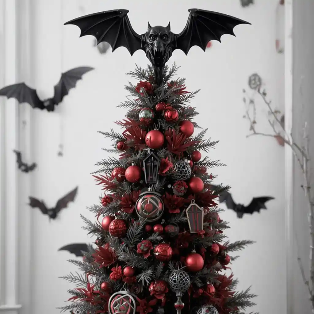 Go for a dramatic look with deep red and black ornaments paired with gothic-style details. Add bat decorations, coffin-shaped ornaments, and finish with a fang-inspired tree topper to create a fun, spooky Dracula-themed vibe.