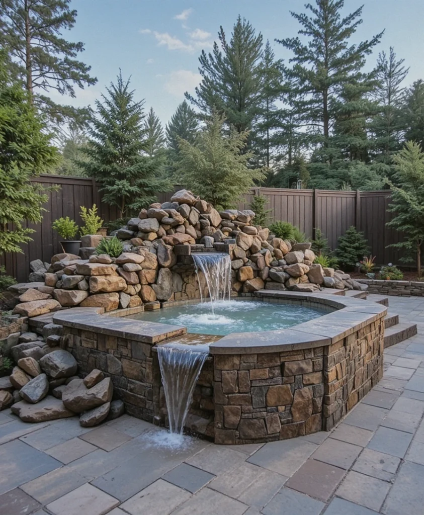 A cascading waterfall adds movement and soothing sound to the jacuzzi area. This sensory-rich Jacuzzi Outdoor Idea 2026 elevates relaxation while creating a striking focal point in the outdoor space.