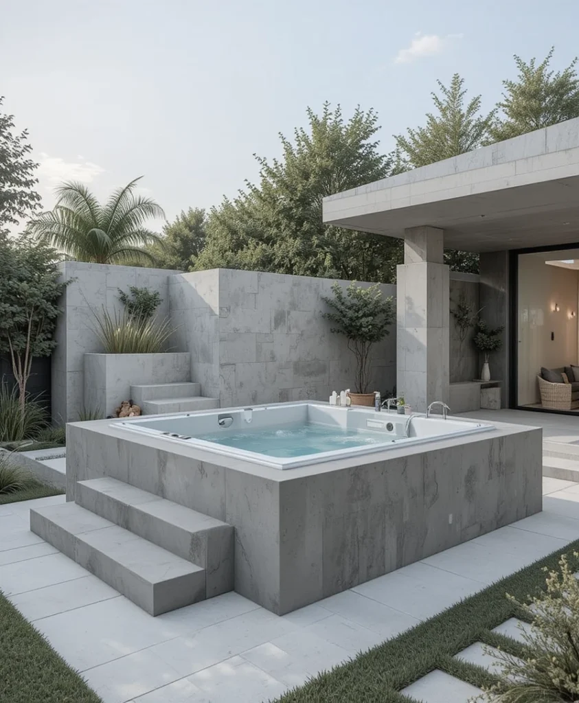 Sleek concrete finishes bring a modern, architectural edge to outdoor jacuzzis. This style focuses on clean lines and neutral tones, making it a timeless Jacuzzi Outdoor Idea 2026 that pairs effortlessly with contemporary landscapes and minimalist homes.