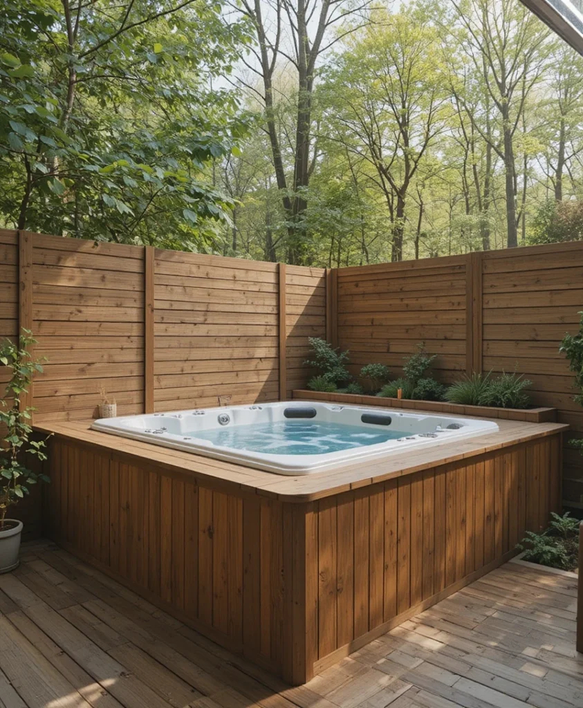 Embedding a jacuzzi into a wooden deck creates warmth and natural harmony. This design softens the look of the jacuzzi while making it feel like a built-in feature, a popular choice among nature-inspired Jacuzzi Outdoor Ideas 2026.
