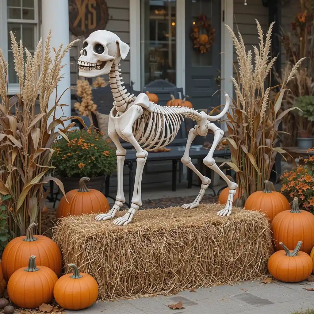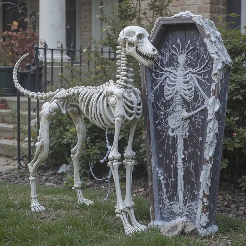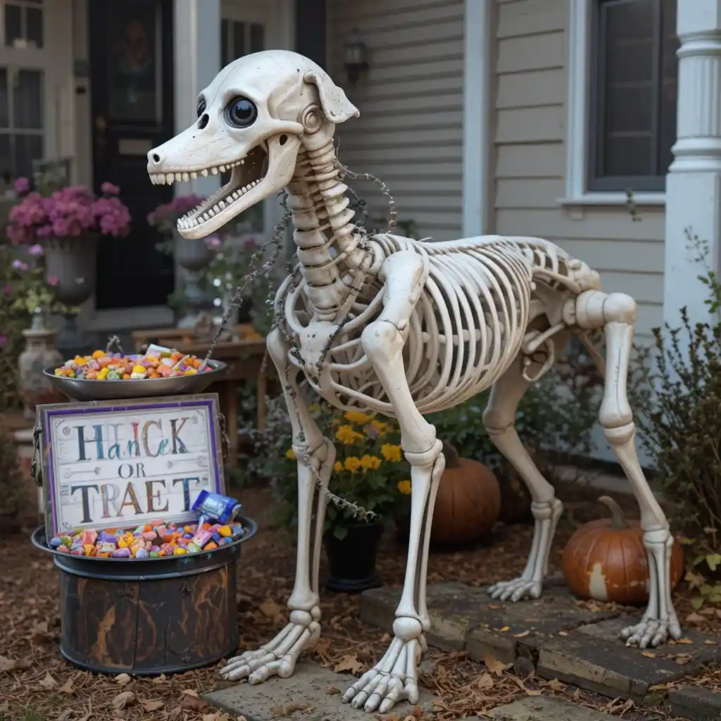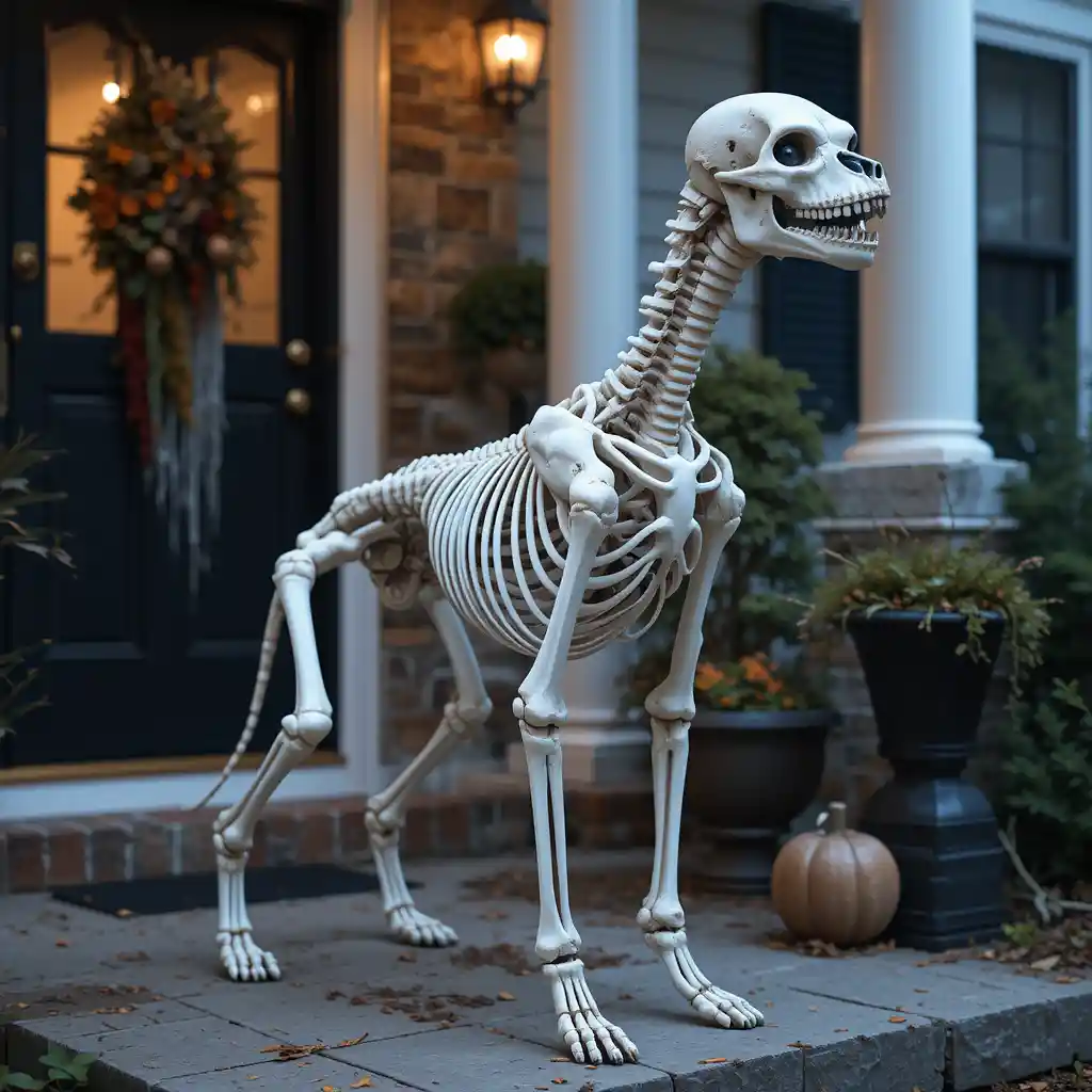Place a large dog skeleton by your front porch as if it’s guarding the entrance. This setup makes your home feel like a haunted mansion and immediately gives guests a spooky welcome.