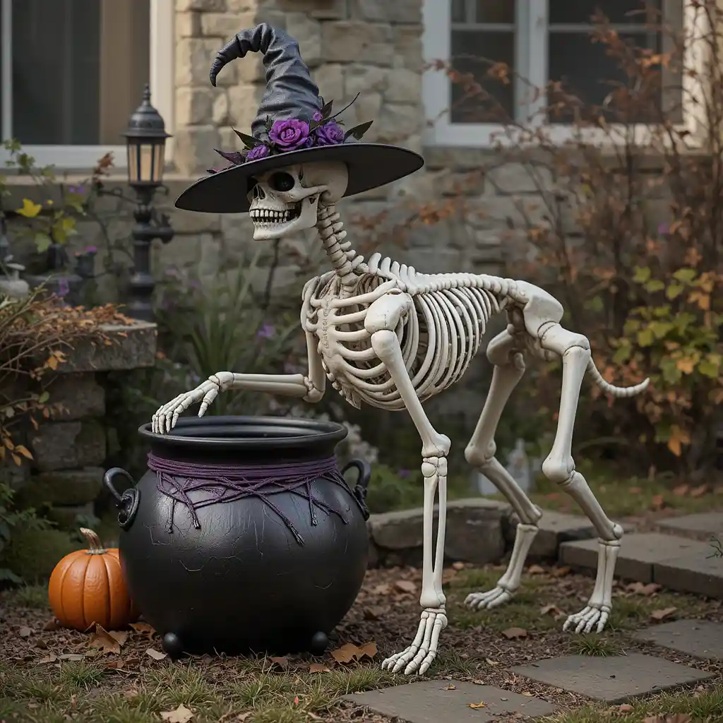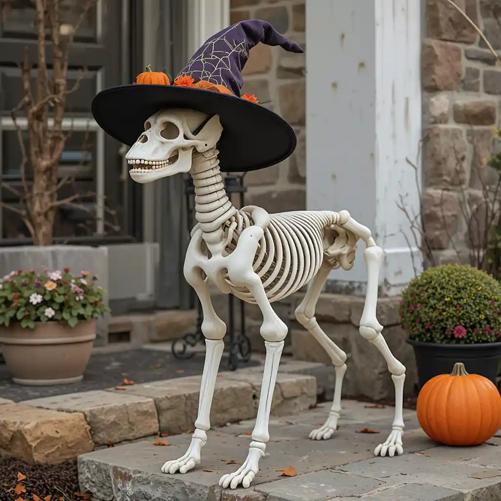 Add a witch hat or Halloween accessory to your skeleton dog for a mix of funny and spooky vibes. It’s perfect for family-friendly Halloween displays.