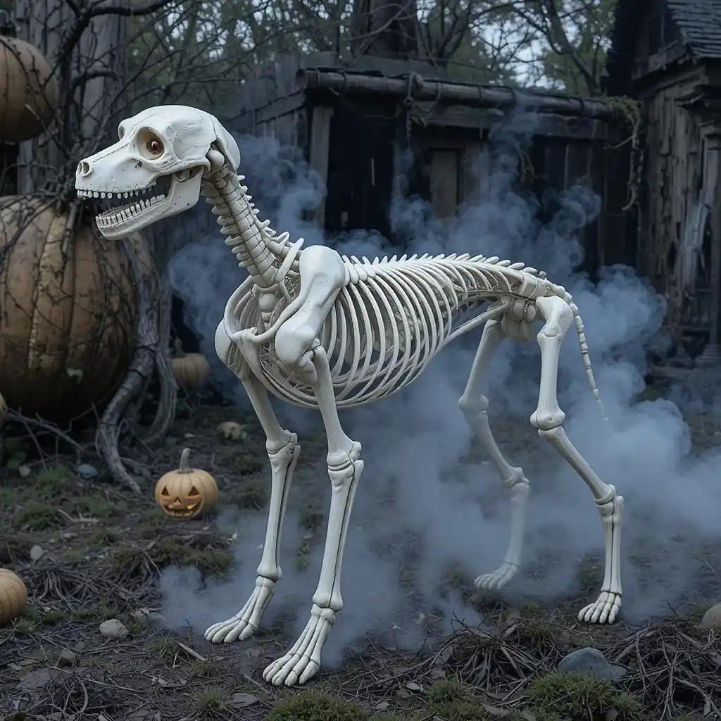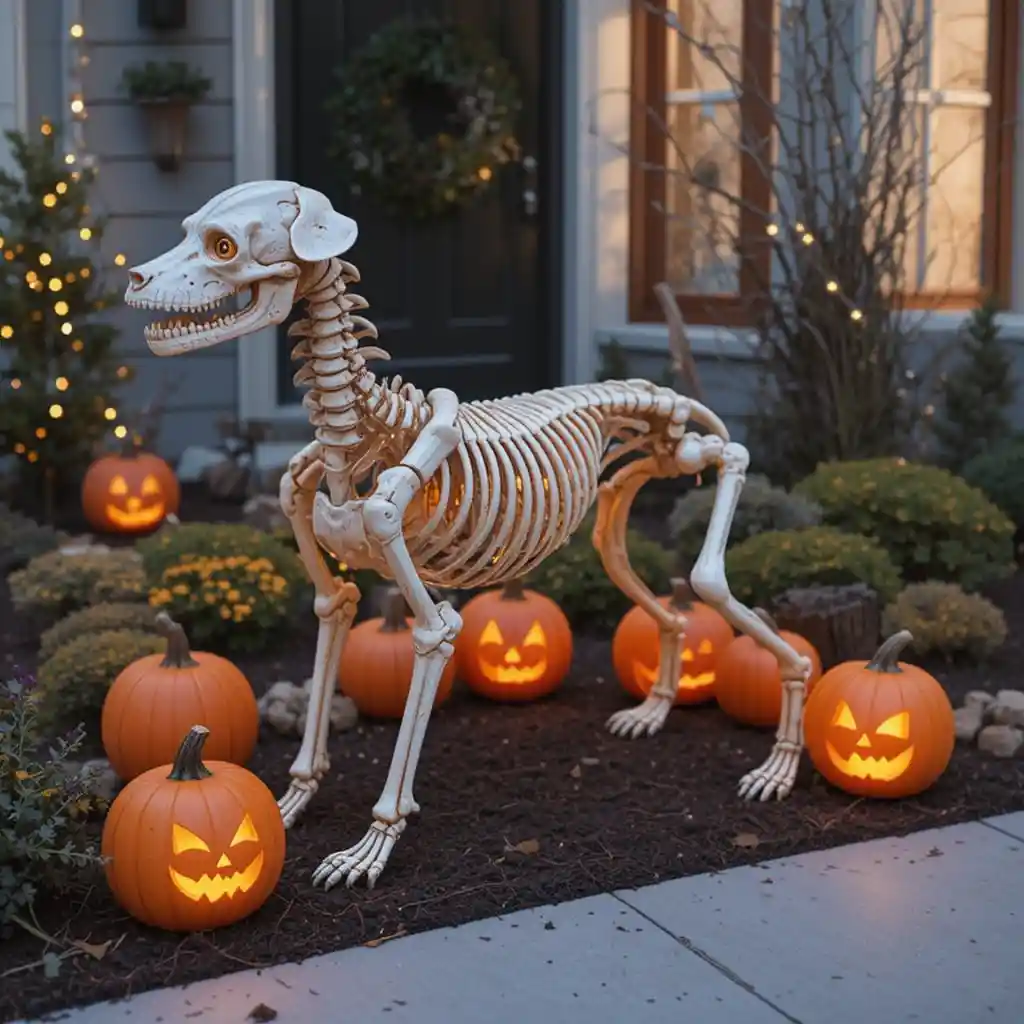 Surround the dog skeleton with glowing jack-o’-lanterns. The mix of creepy bones and cheerful pumpkins balances spooky with festive.