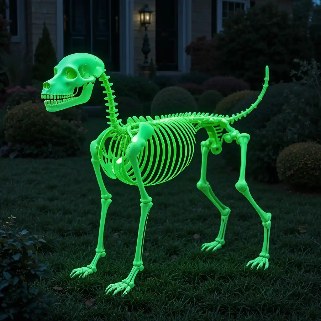 Choose a dog skeleton that glows in the dark to create an eye-catching effect at night. The eerie greenish glow enhances the scary vibe without needing extra lights.