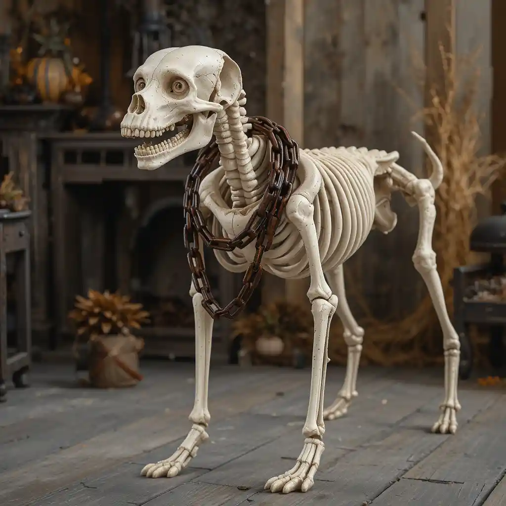 Attach faux rusty chains around the dog skeleton’s neck or body for a prison-guard dog effect. It adds a chilling and dramatic touch to your Halloween décor.