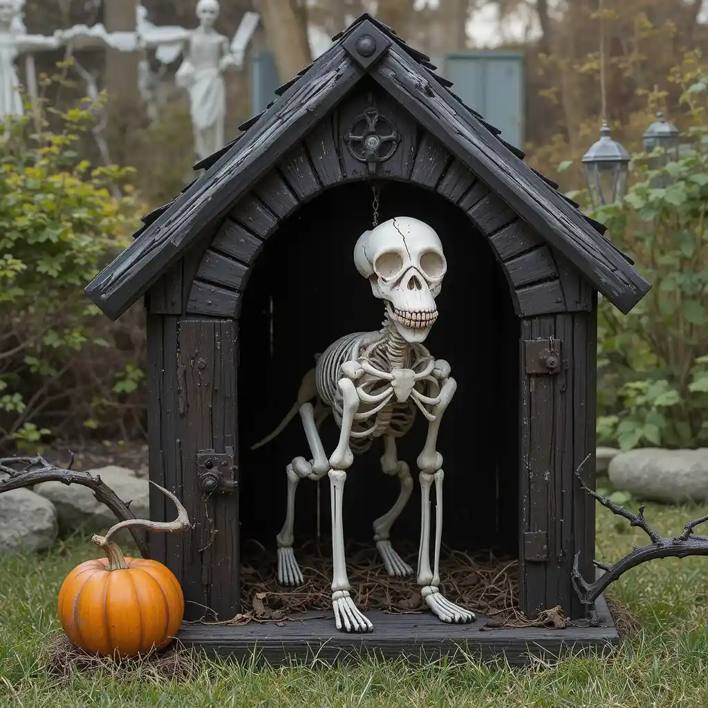 Set up a spooky doghouse and place the skeleton inside. This creates a mini haunted scene perfect for yards or porches.