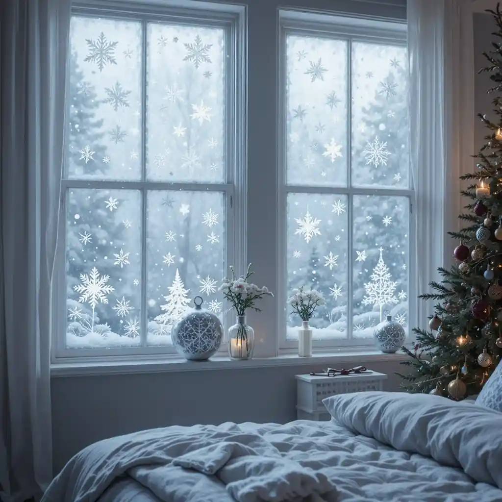 Snowflake window clings or frosted designs bring a whimsical touch to bedroom windows. They reflect natural light beautifully, creating a frosty, enchanting winter scene indoors.